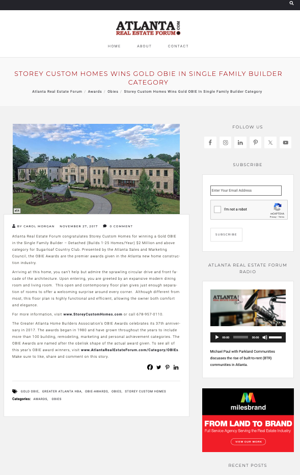 Storey Custom Homes wins Gold Obie in Single Family Builder Category by Atlanta Real Etate Forum.com